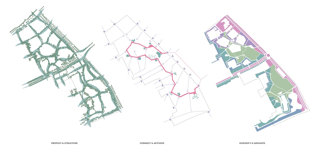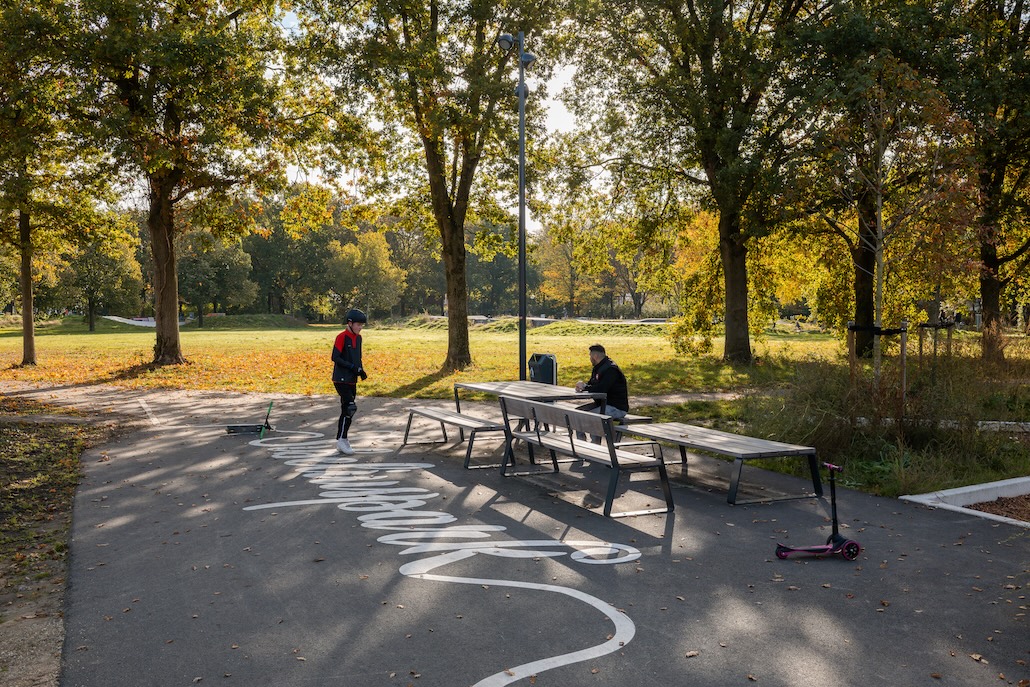 Die Aktivitäten konzentrieren sich entlang dieser Schleife, wodurch zufällige Begegnungen gefördert und Sichtbarkeit sowie Sicherheit verbessert werden. An strategischen Stellen weitet sich das Band zu kleinen Bereichen: Treffpunkten und Plätzen, die Zugang zu den unterschiedlichen Programmbereichen bieten. Stadtmöblierung wurde gezielt in diesen Bereichen platziert, um den übrigen Park frei von Hindernissen zu halten.