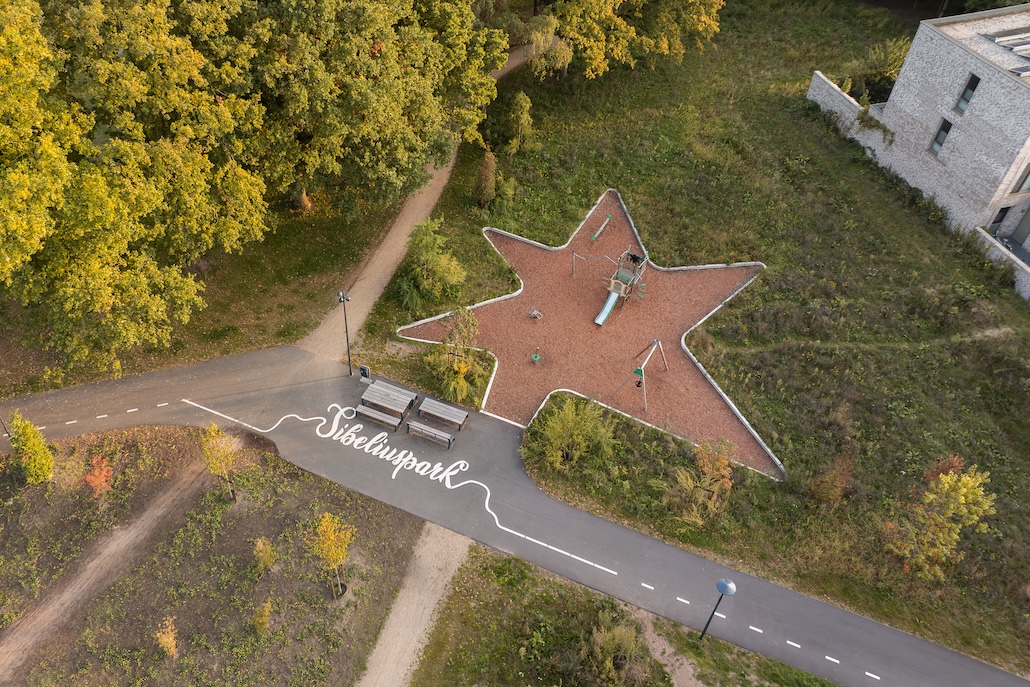 Ein markantes, 3,5 Meter breites „Parkband“ führt als Rundweg durch den Park. Es schafft eine klare Identität und verbindet den Sibeliuspark mit umliegenden Bereichen wie dem Talentencampus und dem TOP-Oss-Stadion. Die großzügige Route ist für Spaziergänge, Radfahren und Skaten ausgelegt, während ein Netz halb befestigter Wege die angrenzenden Wohngebiete verbindet und verschiedene Routen durch den Park ermöglicht.