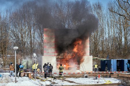 Zum Abschluss des Projektes wurden im Januar und Februar dieses Jahres alle seit Beginn des Projektes gewonnenen Erkenntnisse bei realen Brandversuchen getestet. Diese Versuche fanden auf dem Campus der Technischen Universität München in Garching statt. Mit dabei war auch Felix Steeger. Er ist wissenschaftlicher Mitarbeiter im Team der Hochschule Magdeburg-Stendal. Steeger erklärt, dass mit den Versuchen das sich ändernde Brandverhalten bei Feuern in Räumen in Holzbauweise erfasst werden sollte. Für den Versuch wurden fünf sogenannte Brandräume aus Holz gebaut. Diese Brandräume simulierten Wohnungen im Originalmaßstab. Sie wurden zusätzlich mit Holz vollgestellt, das wiederum die Einrichtungsgegenstände nachstellte. Diese wurden für den Versuch in Brand gesetzt. „Damit die Holzbauteile, also zum Beispiel Wände oder Decken, im Brandfall nicht versagen, werden sie teilweise mit Gips- und Zementplatten bekleidet“, erklärt Steeger. Der Anteil der unbekleideten Holzoberflächen sei bei den fünf Versuchen immer weiter erhöht worden. Zusätzlich zu der Bekleidung der Holzbauteile wurden auch verschiedene Holzbauweisen in den Versuchen betrachtet.