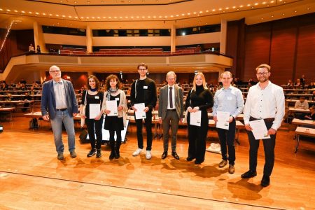 Pascal Fröhlich (2. V. re.) bei der Preisverleihung in Friedrichshafen. Das Bild zeigt ihn zusammen mit den weiteren fünf Preisträger*innen des Landesbeirat Holz Baden-Württemberg sowie Prof. Ludger Dederich (Hochschule Rottenburg, links) und Forstpräsident Martin Strittmatter (Mitte). (c) HBC