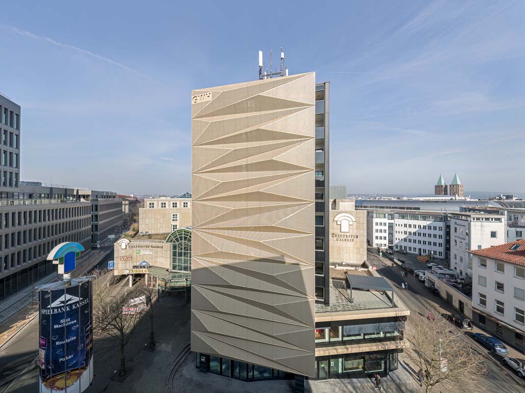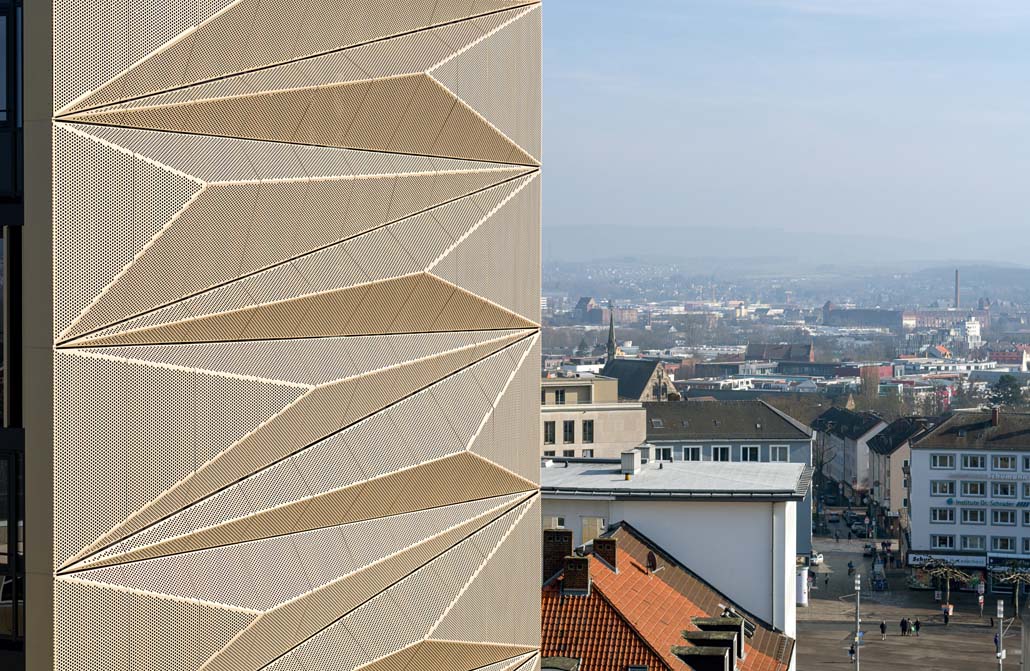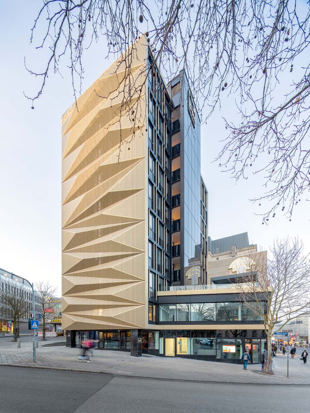 Herzstück der Arbeiten rund um das 1969 errichtete, zehn Geschosse umfassende Gebäude mit 4.575 qm Bruttogrundfläche war die komplette Neukonzeption der Stirnseite, die nun als dreidimensionale, sandfarbene Metallfassade der Innenstadt ein neues Gesicht verleiht und einmalige Licht- und Schattenspiele entfaltet. Christopher Hammerschmidt, Geschäftsführer von Dietz Joppien Hammerschmidt, erläutert: „Unser Kernansatz war es, die in der Vergangenheit buchstäblich tote Fassade neu zu inszenieren und zum Mittelpunkt eines Gesamtentwurfs zu machen, der eine deutliche städtebauliche Wirkung entfaltet. Das Gebäude zeichnet sich nach Abschluss der Arbeiten durch einen unverwechselbaren, spannungsgeladenen Charakter aus, ist nachhaltig, energieeffizient, zeitlos modern und trägt damit seiner Bedeutung als Landmark im Herzen der Stadt Rechnung.“