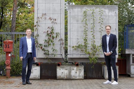 Die Demonstratoren zeigen eine innovative Systemlösung zur innerstädtischen Gebäudebegrünung, bestehend aus mehrschichtigen Betonfertigteilelementen. (v.l.n.r.) Prof. Dr.-Ing. Matthias Pahn und Dipl.-Ing. Fabian Penkert, beide TU Kaiserslautern. Reiner Voß (c) TUK / view