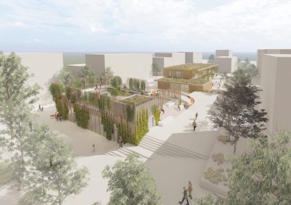 Der Entwurf von UTA Architekten und Stadtplaner GmbH (Stuttgart) mit Koeber Landschaftsarchitektur GmbH (Stuttgart), Bureau Baubotanik, Transsolar KlimaEngineering und ohlfschoch Architekten überzeugte die neunköpfige Jury unter dem Vorsitz von Prof. Jens Wittfoht: Sie wählte das moderne Konzept einstimmig zum Sieger. Der Entwurf sieht sowohl für die Kita als auch für die Begegnungsstätte eine begrünte Fassade und ein begrüntes Dach vor, wodurch  eine starke Verbindung zwischen den umliegenden Wohngebäuden und der zentralen Grünfläche entsteht. Eine über zwei Geschosse vorgesetzte Fassadenkonstruktion an der Begegnungsstätte dient als Rankhilfe und bildet so ein offenes „grünes Zimmer“ auf dem Dach des Gebäudes, das als Stadtteilterrasse von allen Anwohner*innen des Quartiers genutzt werden kann – Spielmöglichkeiten für Kinder inklusive. Zwischen den Gebäuden werden überwiegend grün angelegte Flächen gestaltet werden. Das Kita-Gebäude setzt sich aus einem eingeschossigen und einem zweigeschossigen Bauteil zusammen, in der sechs Gruppen Platz finden sollen. Ein großzügiger Außenbereich mit unterschiedlichen Spielbereichen schließt sich an der Südseite des Gebäudes an. Beide Häuser sollen vorzugsweise aus Recyclingbeton errichtet werden.