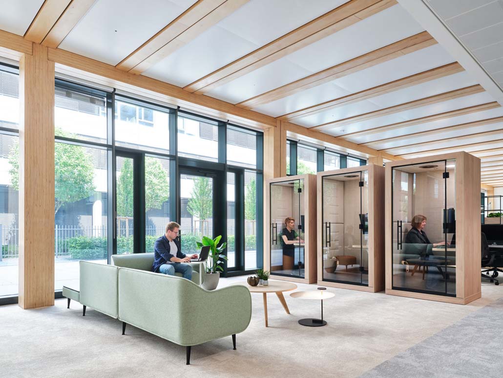 Der äußeren Lebendigkeit des Quartiers entspricht ein Innenraum, der durch ein hohes Maß an Aufenthaltsqualität geprägt ist. Genslers Entwurf erlaubt es, flexibel zwischen verschiedenen Arbeitsmodi zu wechseln. Grundlage ist ein vollständig modulares System, das sowohl teamorientierte Sofa-Layouts als auch klassische Schreibtischzonen ermöglicht. Ein dreieckiger Kollaborationsbereich kann sowohl für Workshops als auch als informeller Essplatz genutzt werden. Ein zentrales, lichtdurchflutetes Atrium empfängt die Besucher. Biophile Elemente strukturieren die Fläche und tragen zur akustischen Qualität bei.