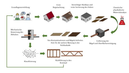 Dafür wollen die Wissenschaftler:innen gemeinsam mit den Industriepartnern zunächst erfassen, in welchen Mengen potenziell wiederverwertbares Altholz anfällt. Außerdem wollen sie mechanische Verfahren entwickeln, um metallische Fremdkörper und Holzschutzmittel im verbauten Holz aufzuspüren und zu entfernen. Ziel ist es, Klassifizierungsregeln für den Wiedereinsatz des Baustoffs und ein ganzheitliches Wiederverwendungskonzept in Form eines schematisierten Ablaufplans zu erarbeiten.