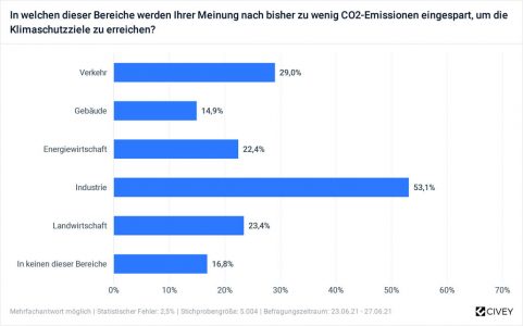 Berlin (pm) – In welchem Bereich sind die CO2-Emissionen noch besonders hoch und wo besteht das größte Einsparpotenzial? Hier liegen die Deutschen mit ihrer Einschätzung in den zentralen Sektoren Energiewirtschaft, Industrie, Verkehr, Gebäude und Landwirtschaft weit neben den tatsächlichen Fakten. Im Rahmen einer repräsentativen Erhebung wurde gefragt, in welchem Bereich bisher noch zu wenig CO2-Emissionen eingespart wurden, um die Klimaschutzziele zu erreichen.