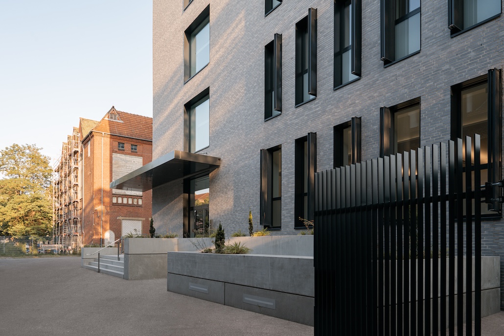 Bauteil F, im zweiten Weltkrieg weitgehend zerstört, wurde bis auf das Betonskelett rückgebaut und gemäß der ursprünglichen Form und Kubatur wiederhergestellt. Die Neuinterpretation der Fassade orientiert sich in der Materialität des Klinkers am Bestand, setzt jedoch mit schmalen, hohen Fensterformaten und markanten Faltläden aus Streckmetall eine klare zeitgemäße Haltung. Die Rasterung wurde dabei durch das bestehende Betonskelett vorgegeben, während die variierenden Fensterpaneele auf die jeweilige Raumnutzung reagieren. (Verwendet wurde hierfür der Ziegel Hebrok Cortina im Dünnformat.) Aufgrund des schlechten Zustands des ursprünglichen Satteldachs wurde der Dachstuhl abgetragen; das neue Flachdach beherbergt die Haustechnik.