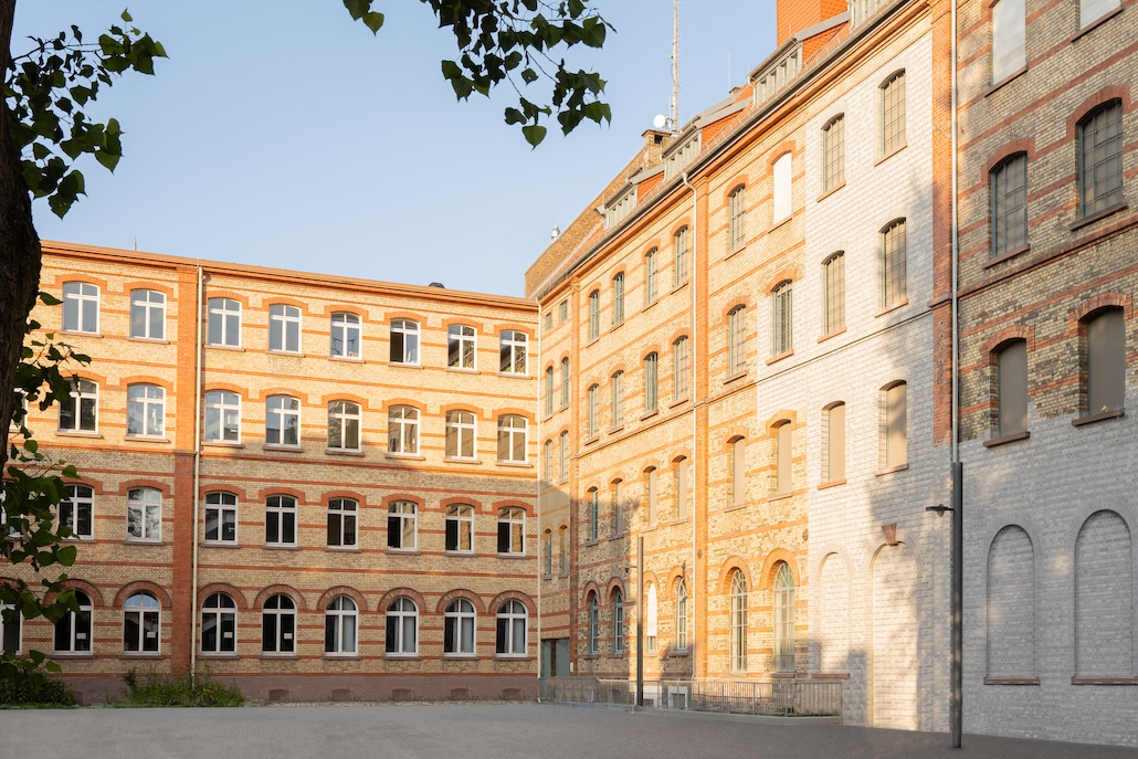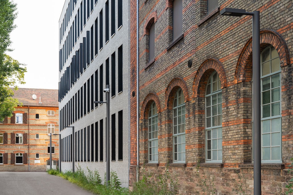 Der Entwurf für die Sanierung der Bauteile E und F sah eine Instandsetzung und Erweiterung der Liegenschaft vor. Leitgedanke der Planung war, die historische Bausubstanz und Geschichte des Areals erlebbar zu machen und ihr moderne Elemente gegenüberzustellen. Die Wunden der Vergangenheit bleiben an der Klinkerfassade bewusst ablesbar und werden – durch Farbdifferenzierung der alten und neuen Klinker – hervorgehoben. (Für die Sanierung der Klinkerflächen kam der Hebrok Cortina im Reichsformat zum Einsatz.) Auch die Rundbögen der Fenster im Erdgeschoß wurden rekonstruiert und mit historischen Schlusssteinen komplettiert. In den oberen Geschossen wurden die historischen Gitterfenster entglast und die Stahlrahmen restauriert; fehlende Fenster wurden nach historischem Vorbild mit Sprossengitter ergänzt. Die innenliegenden modernen Fensterelemente erfüllen die hohen Anforderungen nach Sicherheit und Wärmeschutz.