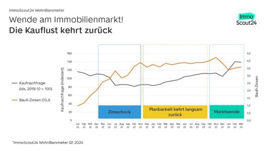 „Angesichts stabiler Zinsen und unzureichender Mietangebote rückt das Thema Immobilienkauf wieder stärker in den Vordergrund. Im Vergleich zum Vorjahr ist das Interesse am Eigentumserwerb erheblich gestiegen – in den Metropolen sogar um 49 Prozent.“, sagt Dr. Gesa Crockford, Geschäftsführerin von ImmoScout24. „Der Angebots-Überhang am Kaufmarkt baut sich bereits ab. Daher nehmen wir an, dass die Kaufpreise in Zukunft steigen werden.“