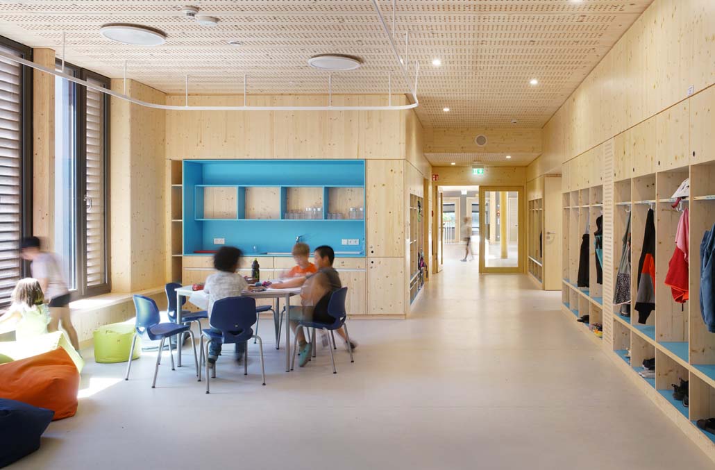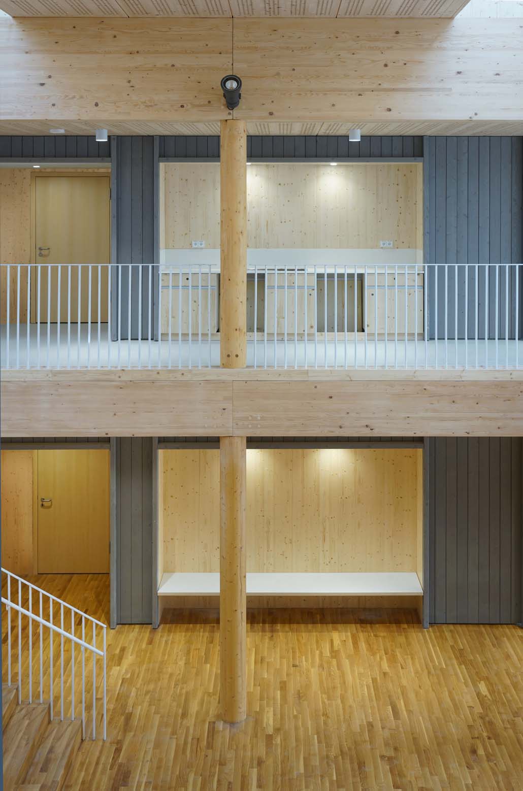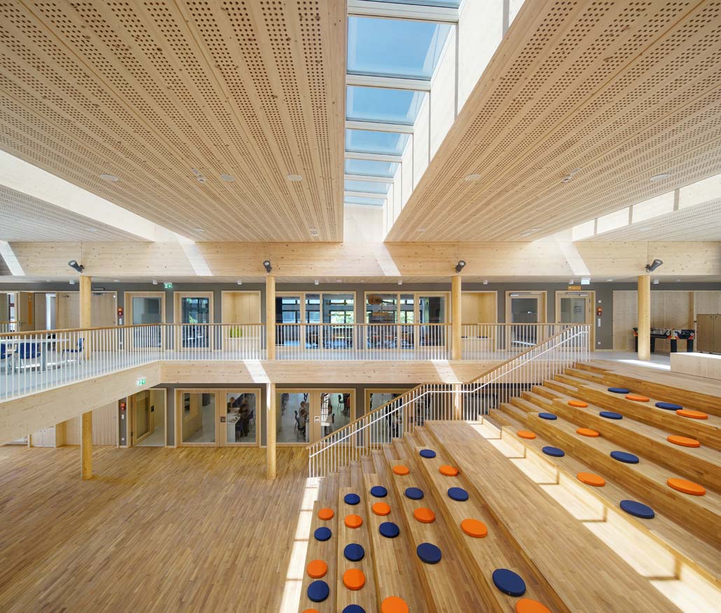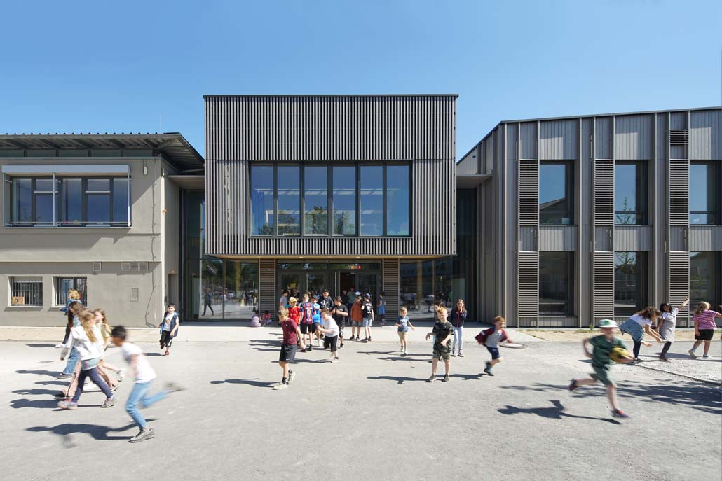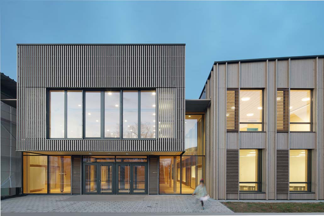 Die auf den Bau von Bildungseinrichtungen fokussierten opus Architekten und das auf Holzbau spezialisierte Ingenieurbüro Fast + Epp legten bei ihrem Erweiterungskonzept besonderen Wert auf eine nachhaltige Weiterentwicklung des Bestands. Aus einem intensiven, von den Nutzern begleiteten Planungsprozess ging ein kompaktes und schlüssig organisiertes Erweiterungskonzept in Holzbauweise hervor, das sowohl den erforderlichen Nachhaltigkeitsaspekten, als auch dem pädagogischen Konzept einer Ganztagsschule für alle Schülerinnen und Schüler gerecht wird.