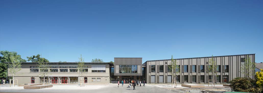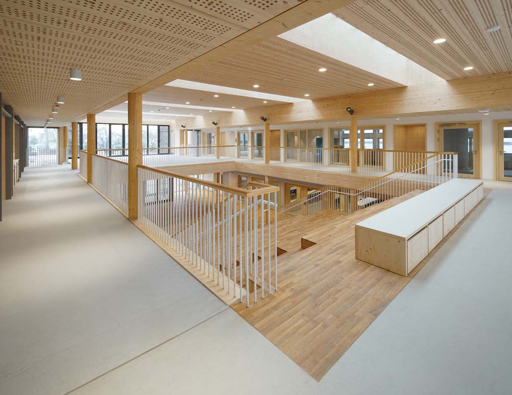 Der ebenfalls zweigeschossige Atriumbau von 1962 wurde umgebaut und beherbergt heute Verwaltungs- und Fachräume sowie die Mensa. An der Ostseite entstand ein Neubau in etwa gleicher Größe, ebenfalls mit Innenhof und in klimaneutraler Holzbauweise, der vier Jahrgangscluster aufnimmt. Zwischen den beiden Gebäuden vermittelt eine neue, ebenfalls in Holzbau errichtete Halle, die den Eingang markiert und das Herz der Schule bildet. Hier befindet sich die multifunktionale, 2-geschossige Aula sowie Spiel-, Lese- und Aufenthaltsbereiche. Die Sitzstufen-Treppe verbindet die beiden Geschosse miteinander und bildet gleichzeitig eine Basis für Schulveranstaltungen.
