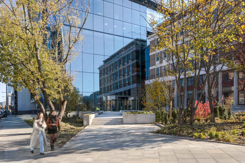 Der doppelgeschossige, verglaste Verbindungsraum fungiert als „Brücke“ zwischen den beiden Gebäuden. Die leichte, transparente Struktur gewährleistet den Erhalt der ursprünglichen Lobby einschließlich der geschützten Kolonnade, der Treppe sowie drei von vier Fassaden. Diese Elemente wurden unter strengen denkmalpflegerischen Vorgaben restauriert.