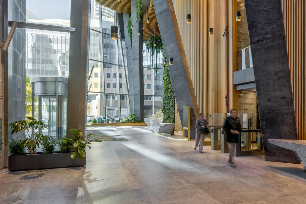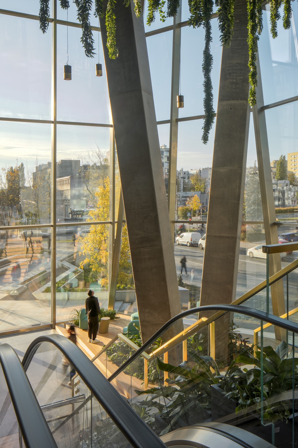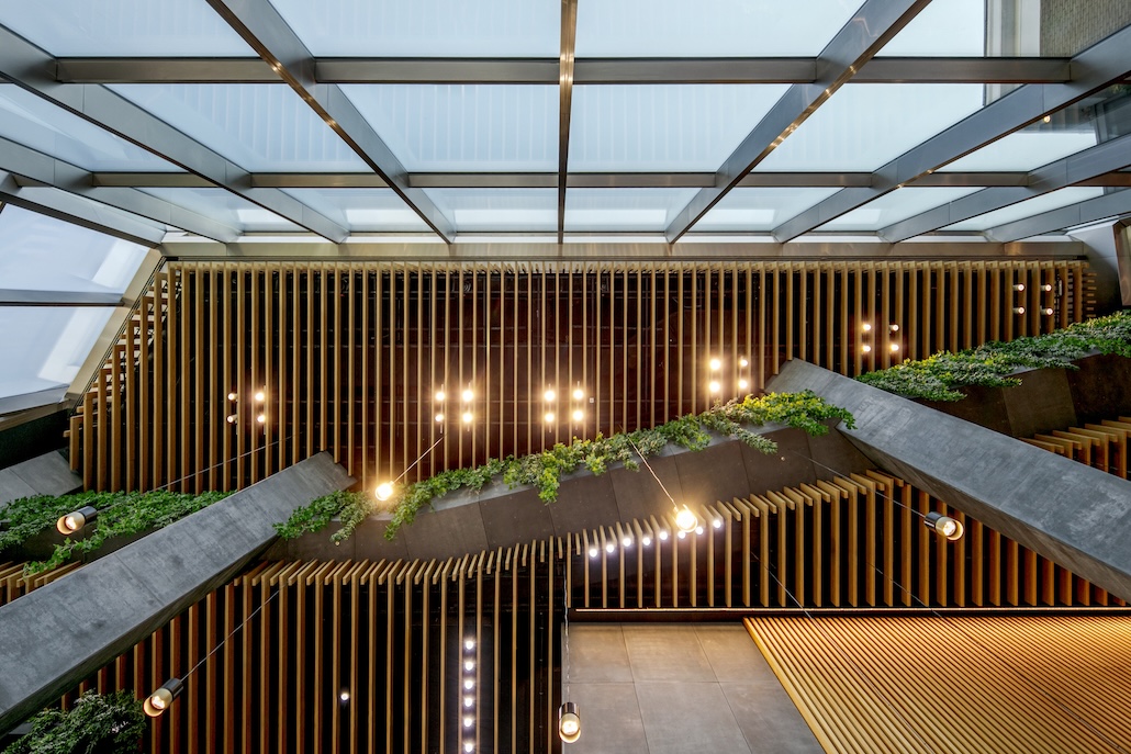 Die Gestaltung der verbindenden Lobby kombiniert industrielle Elemente – etwa graphitfarbene Betonstützen – mit warmen Materialien und Begrünung. Holzpaneele, Pflanzeninstallationen und grüne Wände prägen den Raum. Eine Galerieebene sowie breite, multifunktionale Treppen schaffen Aufenthaltsbereiche für informelle Begegnungen und machen die Lobby zu einem lebendigen Mittelpunkt des Ensembles.
