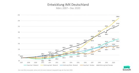 Berlin (pm) – In der gesamtdeutschen Betrachtung zeigten sich die Preise für Wohnimmobilien im abgelaufenen Jahr unbeeindruckt von der anhaltenden Corona-Pandemie. Die Angebotspreise für Bestands- und Neubau-Wohnungen sowie für neugebaute Einfamilienhäuser stiegen 2020 deutschlandweit weiter an. In hochpreisigen Metropolmärkten wie Frankfurt am Main, Köln, München und Hamburg zeichnet sich allerdings eine Tendenz zu stagnierenden Preisen und leichten Preiskorrekturen ab. Dies belegt der aktuelle Wohnimmobilienindex IMX von ImmoScout24.