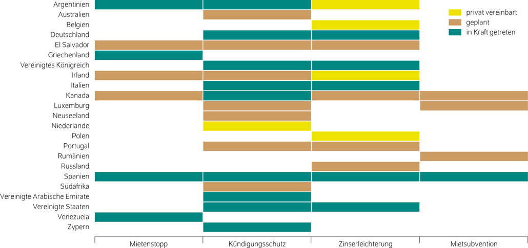 Am häufigsten wird der Kündigungsschutz der MieterInnen verstärkt. Seit Mitte März 2020 haben viele Länder die Möglichkeit, MieterInnen, deren Einkommen besonders stark wegen der COVID-19-Pandemie zurückgegangen sind, wegen Mietrückständen zu kündigen, ausgesetzt oder planen dies. Dazu gehören: Argentinien, Australien, El Salvador, Deutschland, Irland, Italien, Kanada (Quebec und Ontario), Luxemburg, Niederlande, Neuseeland, Portugal, Spanien, die Vereinigten Arabischen Emirate (Abu Dhabi und Dubai), die USA, das Vereinigte Königreich und Zypern. [2] Meistens beziehen sich die Regelungen auf private Wohnimmobilien. In Portugal wie auch in Deutschland werden jedoch die MieterInnen von Wohn- und Gewerbeimmobilien geschützt. Frankreich schützt dagegen bis jetzt nur kleine und mittlere Unternehmen[3], während Rumänien[4] die Unternehmen allgemein vor Kündigung schützt.