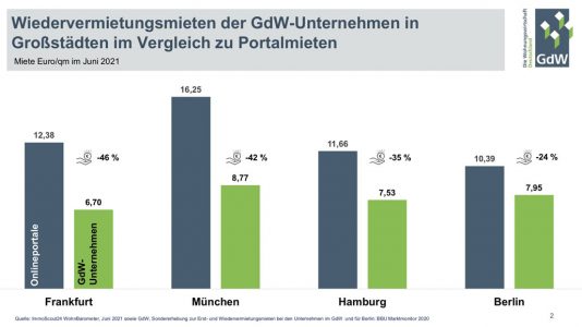 Am deutlichsten ist der Abstand in Frankfurt am Main und München. Hier liegen die Wiedervermietungsmieten der GdW-Unternehmen um 46 Prozent beziehungsweise 42 Prozent unterhalb der in Inseraten dargestellten Angebote zur Wiedervermietung von Wohnungen. In Hamburg liegt die Wiedervermietungsmiete der GdW-Unternehmen bei 7,53 Euro pro Quadratmeter im Vergleich zu 11,66 Euro bei Wiedervermietung in den Portalen. Ein Unterschied von 35 Prozent. Auch Berlin liegt die Differenz von GdW-Mieten und Portalangaben bei über 2 Euro pro Quadratmeter. Damit sind Mietangebote bei GdW-Unternehmen auch hier um rund ein Viertel günstiger als die Mietangebote in Online-Portalen.