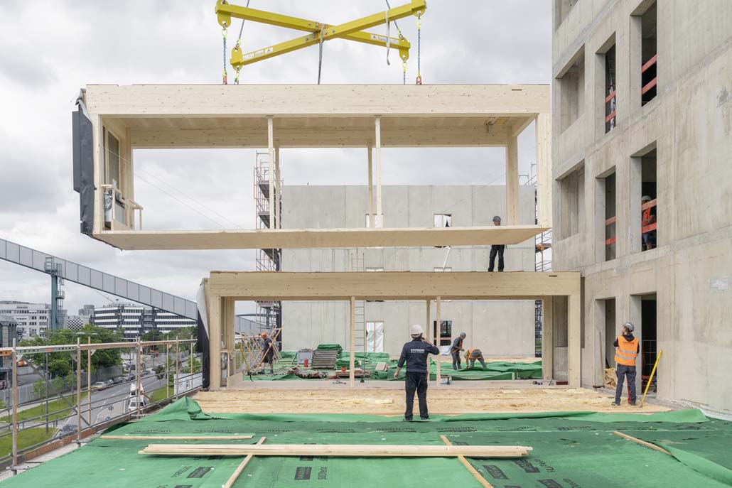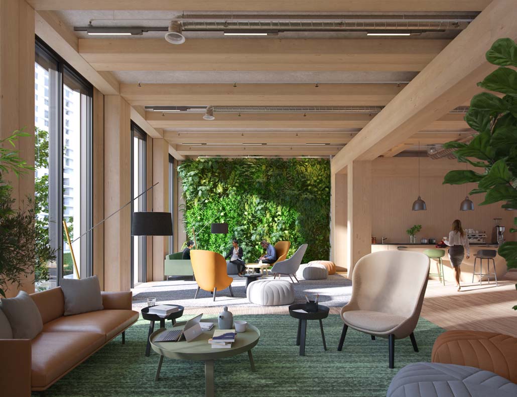 In dem achtstöckigen Timber Pioneer im Europaviertel wurden insgesamt über 1.800 Kubikmeter FSC-zertifiziertes Fichtenholz verwendet, was seinen Rohbau vollständig CO2-neutral macht. Der komplette Neubau, dessen Grundstein 2020 gelegt wurde, spart gegenüber einem konventionellen Betonbau 80 Prozent CO2 ein. Zudem wurden durch Einsatz vorgefertigter modularer Verbundelemente mit ressourcenschonenden Materialien die Bauarbeiten beschleunigt, was weniger Baulärm, Staub und Abfall bedeutet und dem Mikroklima zuträglich ist. 14.100 der insgesamt 17.600 Quadratmeter zur Verfügung stehenden Fläche entfallen auf Büroräume, die sich durch flexible Raumteilung zu individuellen Bürokonzepten wandeln lassen. Durch die Holzbauweise wird das Raumklima innerhalb der Räumlichkeiten verbessert und drei Meter hohe Decken sorgen für großzügigen Lichteinlass. Auch der angenehme Holzgeruch ist für das Wohlbefinden nicht unerheblich. Eike Becker über das Konzept: „Moderne Gebäude müssen alle Aspekte des heutigen Arbeitslebens berücksichtigen: Ein gesundheitsförderndes Arbeitsumfeld, flexible Flächen sowie Platz für Begegnung und Austausch sind wichtiger denn je. Timber Pioneer wird diesen Ansprüchen gerecht, heute wie morgen.“ Der Ansatz findet Zuspruch: Als Hauptmieter hat sich bereits Universal Investment ca. 10.000 Quadratmeter der Bürofläche gesichert.