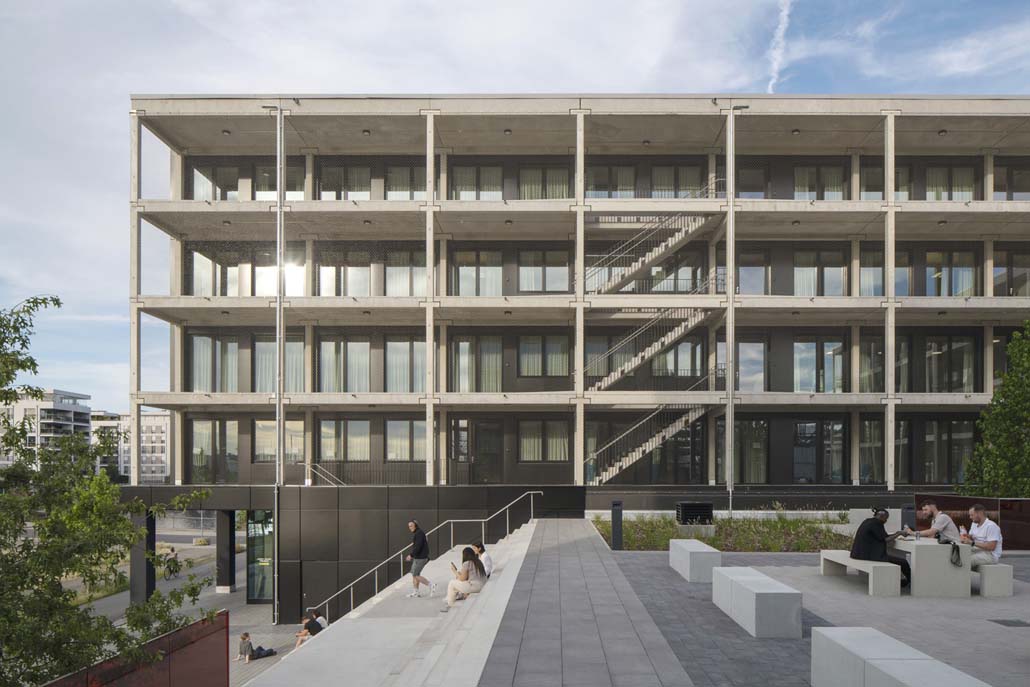 Ein ähnlich nachhaltiges Projekt, das die Menschen in den Fokus rückt, ist das ROCKYWOOD. In nur eineinhalb Jahren entstand auf rund 11.000 Quadratmetern ein Ort für „neues Arbeiten“. Der Clou: Bei ROCKYWOOD handelt es sich um zwei Gebäude – Rocky und Wood –, die zusammen ein Mikroquartier bilden. Das Wood wurde in Holzmodulbauweise gefertigt, was – ähnlich wie bei Timber Pioneer – für ein angenehmes und gesundes Raumklima sorgt. Hier wurden 2.600 Kubikmeter Holz verwendet, somit ca. 2.500 Tonnen CO2 gebunden. Rocky dagegen ist ein klassischer Betonbau, hier wurden aber durch architektonische Kniffe verschiedene Bedürfnisse berücksichtigt: Die Loftbüros ermöglichen einen ungehinderten Blick auf den Offenbacher Hafen und die beiden unteren Etagen sind über eine Rampe verbunden, was dem Hauptmieter, einem Fahrradspezialisten, ein besonderes Anliegen ist. Im ROCKYWOOD ist außerdem ein soziales Projekt beheimatet: Der Boxclub Nordend Offenbach, ein bundesweit anerkanntes Gewaltpräventions- und Integrationsprojekt, darf für die nächsten 20 Jahre die Räumlichkeiten und den Außenbereich „Playground“ mietfrei nutzen. Eike Becker: „Der Außenbereich mit Zugang zum Mainufer ist eine öffentlich zugängliche Begegnungsfläche in der Mitte des Ensembles. Unser Ziel war es, nachhaltige Architektur und soziales Engagement in Bürogebäuden mit bester Arbeitsatmosphäre zu vereinen. Damit steht ROCKYWOOD für kreative Quartiersentwicklung mit positiver Klimabilanz.“