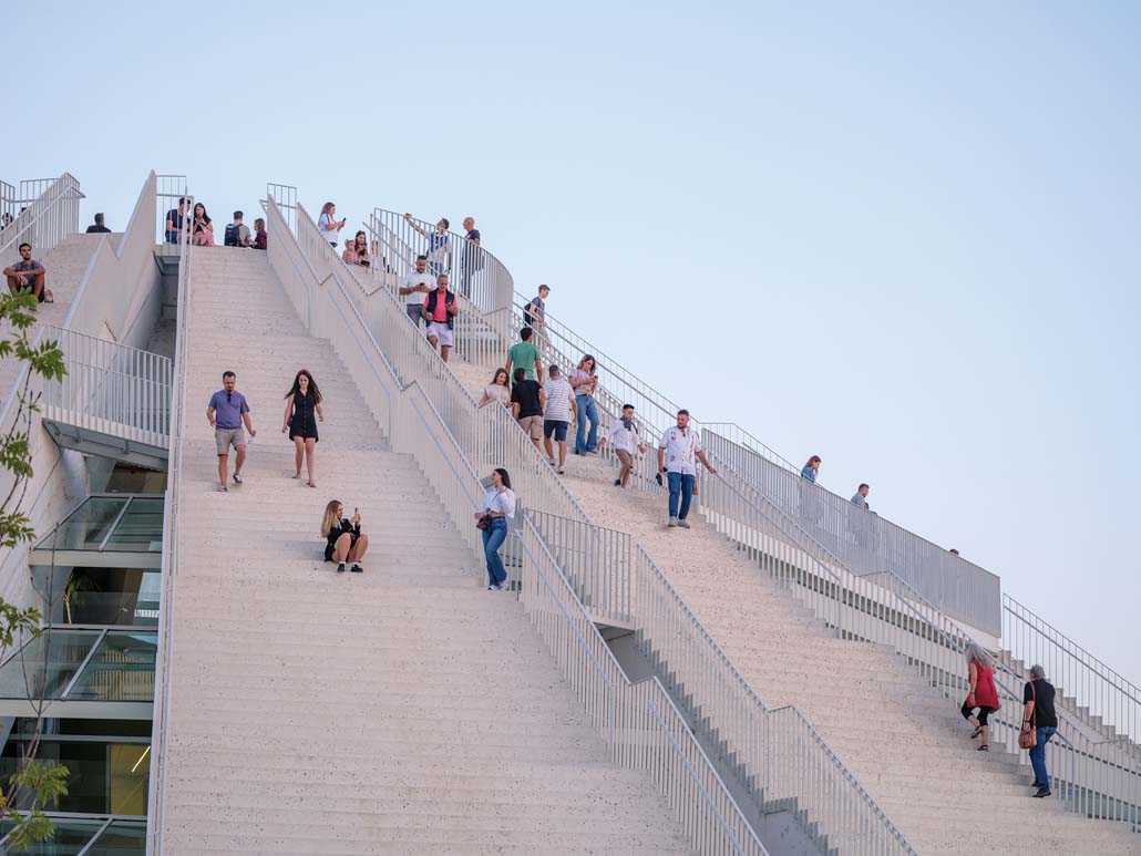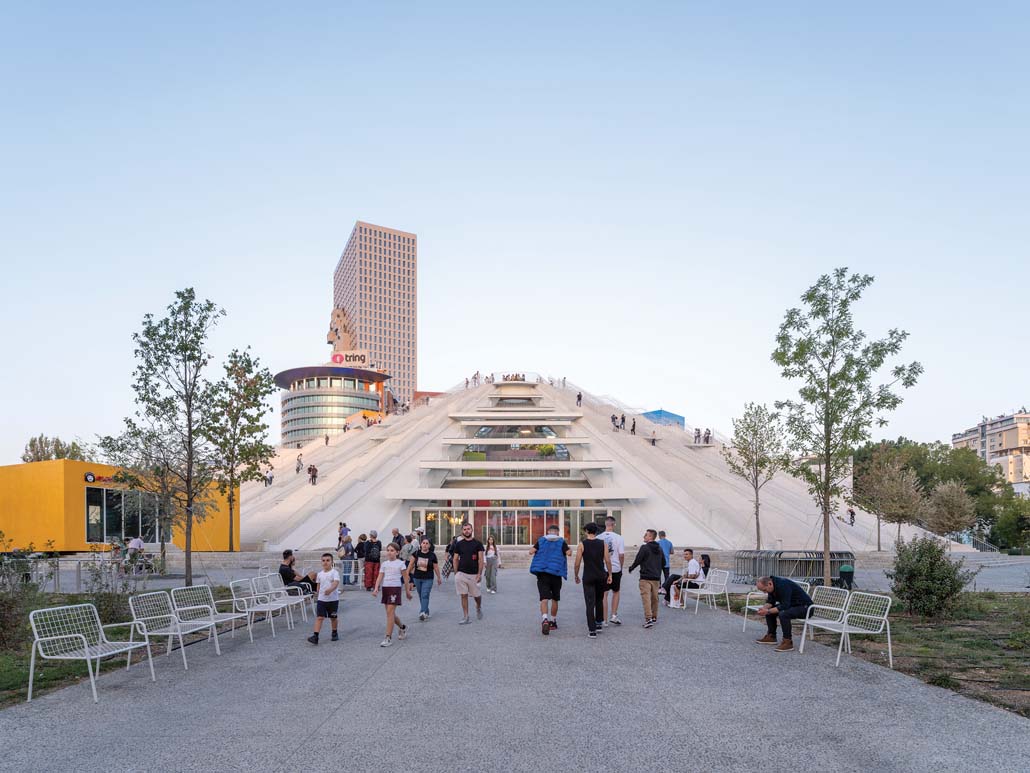 Im Rahmen der ICONIC AWARDS 2025 zeigt dies exemplarisch die von MVRDV umgestaltete Pyramide von Tirana in Albanien. Errichtet in den 1980er-Jahren als Denkmal für Diktator Enver Hoxha, stand das monumentale Bauwerk nach dem Ende des Regimes für eine umstrittene Vergangenheit und verfiel zusehends. Statt Abriss entschieden sich die Architekt*innen für Transformation: Die hermetische Betonarchitektur wurde geöffnet, mit breiten Freitreppen und großzügigen Durchgängen sowie weiteren Zugängen neu erschlossen, die die Betonhülle mit der Stadt verknüpfen und vielfältige Bewegungsströme zulassen. Heute beherbergt die Pyramide Bildungs- und Kulturflächen, die von Start-ups, NGOs und jungen Initiativen genutzt werden. Wo früher ein unnahbares Monument stand, bietet heute eine offene Struktur Raum für wechselnde Programme. Die Pyramide behält zwar ihre ikonische Präsenz, doch ihre Lesart hat sich grundlegend verändert – von der Machtdemonstration hin zu einer nutzbaren, urbanen Infrastruktur, die für den Menschen gemacht ist. Und ihre monumentale Gestalt sogar zugunsten eines menschlichen Maßstabs aufzugeben vermag.