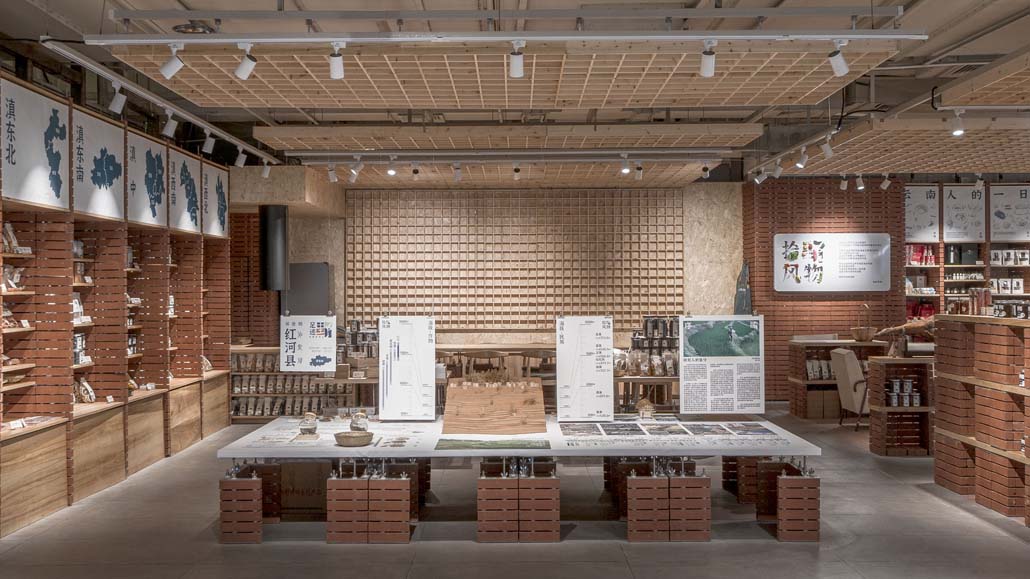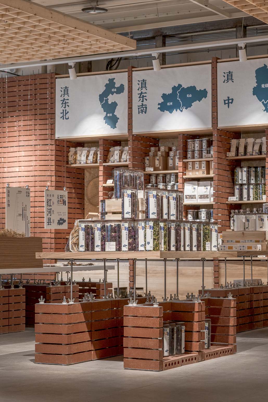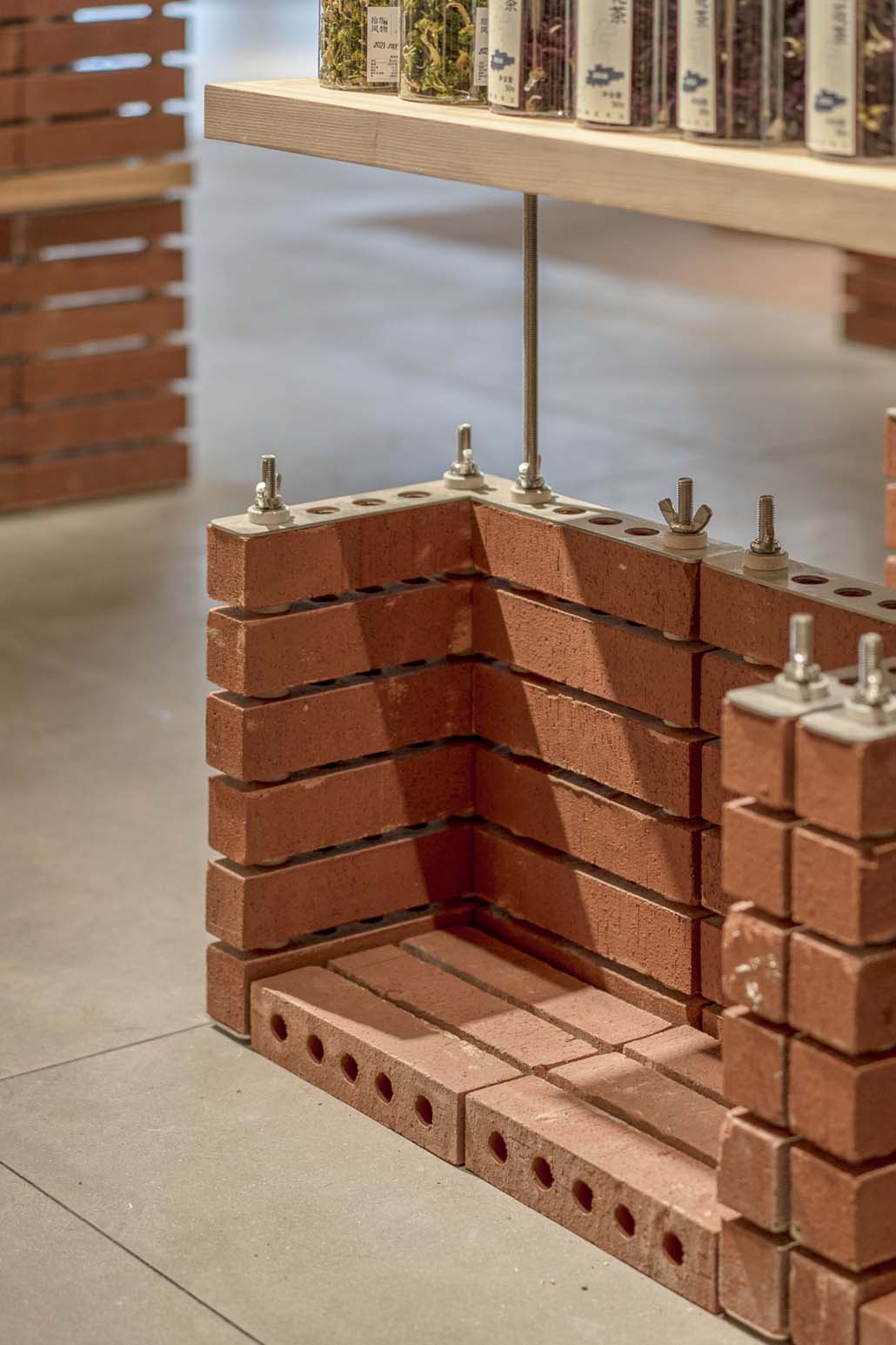 Wie sich diese Prinzipien räumlich übersetzen lassen, zeigt der Shiyefengwu Shuncheng Store in Kunming, China, entworfen von Studio D’Arkwave. Auf nur 108 Quadratmetern entwickelten die Planenden eine hochgradig adaptive Raumstruktur. Anstelle individuell gefertigter Möbel entwickelte das Büro ein modulares Stecksystem, das schnelle Montage und Demontage ohne Bohren oder Schneiden erlaubt. Zum Einsatz kommen einfache, regional verfügbare Materialien: Lochziegel aus einem nahegelegenen Werk, verschraubte Gewindestangen mit Muttern und Regalböden aus unbehandeltem Eschenholz. Drei Fixpunkte – eine abstrahierte Yunnan-Karte, eine rotierende Plattform und eine zentrale Kücheninsel – strukturieren den Raum, während die übrigen Module frei verschoben, ergänzt oder entfernt werden können.