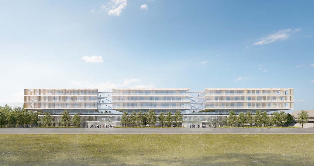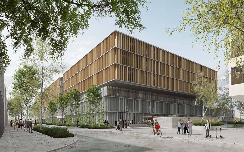 Das äußere Erscheinungsbild folgt der Idee eines begrünten Sockels, über dem hölzerne Baukörper scheinbar schwerelos schweben. Die beiden unteren Geschosse bilden diesen plastisch ausgeformten Sockel und fügen sich harmonisch in das architektonische Gesamtkonzept ein. Die darüber liegenden Theorieräume verfügen über einen festen Sonnenschutz aus vertikalen Holzlamellen, der eine sommerliche Überhitzung reduziert. Dieser Sonnenschutz erzeugt zudem eine filigrane Holzstruktur, die den Gebäuden in der Fernwirkung eine schwebende, warm schimmernde Anmutung mit einer markanten Charakteristik verleiht. Das nachhaltige Energiekonzept umfasst die Nutzung von Geothermie und Photovoltaik, sodass ein Großteil des Energiebedarfs durch erneuerbare Quellen gedeckt werden kann.